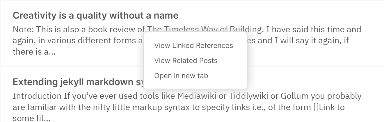 Context menus are a great way to improve user experience if they are done correctly. Given that our theme has a feed-link structure for the landing page, it leverages the opportunity and saves second time visitors who have already read the article and are only here to see other related articles or the backlinks by just simply right clicking on the feed. Thereby saving users the unnecessay time involved with clicking on a link and scrolling all the way down to see the backlinks or related articles.