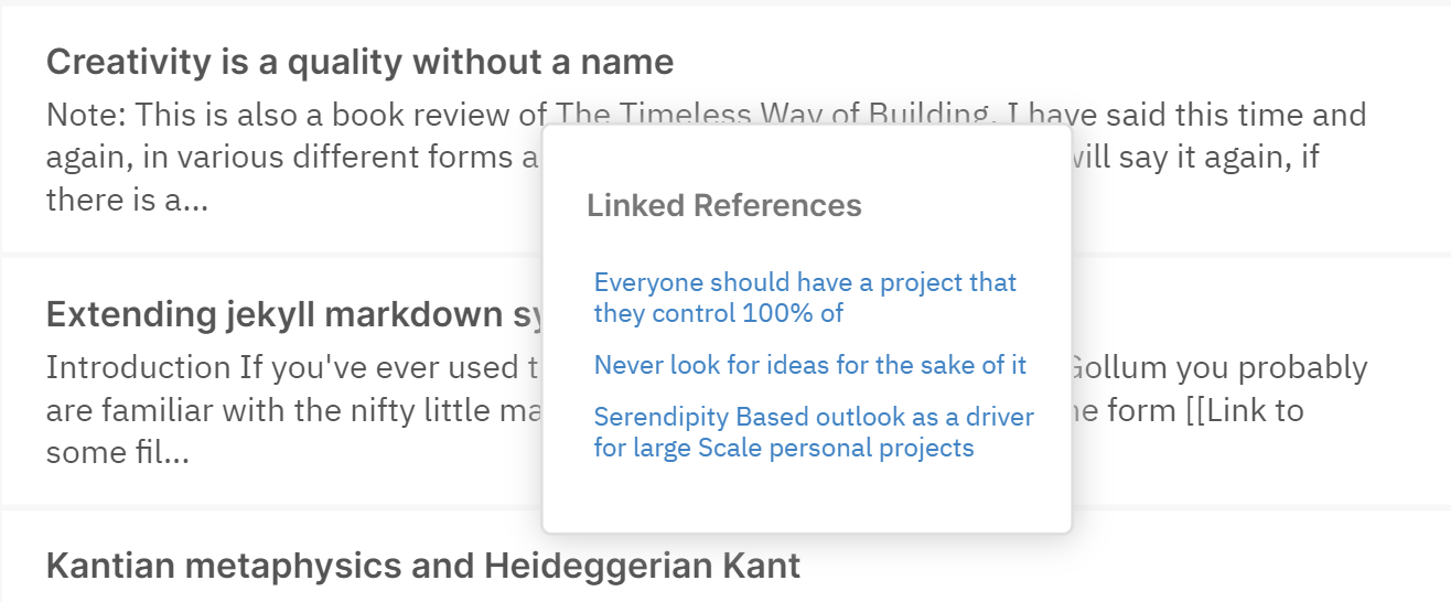 Backlinks or as Roam Research calls it “Birdirectional Links” is a nifty little feature that allows not only users reading your essays/articles to encounter interesting related articles, this is something you as a author yourself will see how powerful it is once you start browsing around your website. Backlinks are basically a link on PostA indicating all the mentions of PostA on different Posts.